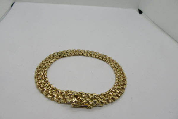 Täiesti uus ja Eestis käsitööna valmistatud Bismarck mustriga kuldkäekett. Käeketi pikkuseks on 20 cm-i ja laius 9,1 mm; kõrgus 3,5 mm. Kuldkäeketil on karplukk ja turvaaas. Käeketi kaaluks 32,58 grammi ja kannab proovi 585, peal ka meistrimärk ja meie firmamärk… Loe edasi →