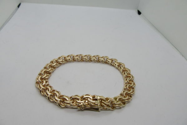 Heas korras ja Eestis käsitööna valmistatud Topelt-Bismarck mustriga kuldkäekett. Kuldkäeketi pikkuseks on 19,7 cm, laiuseks 8,7 mm, kõrguseks 1,8 mm, korralik karplukk ja turvaaas, kaaluks 17,17 grammi. Kuldkäekett kannab proovi 585, peal meistrimärk. Topelt-bismarck on Eestis väga vähe levinud, sest… Loe edasi →