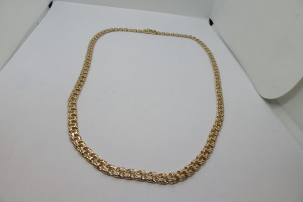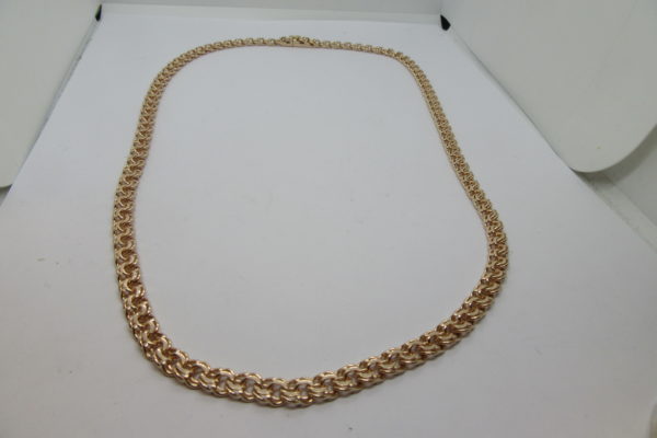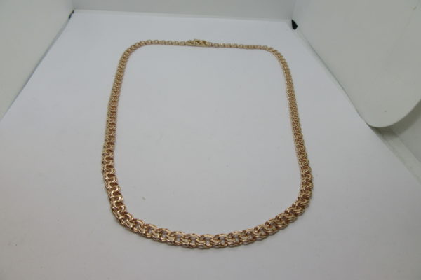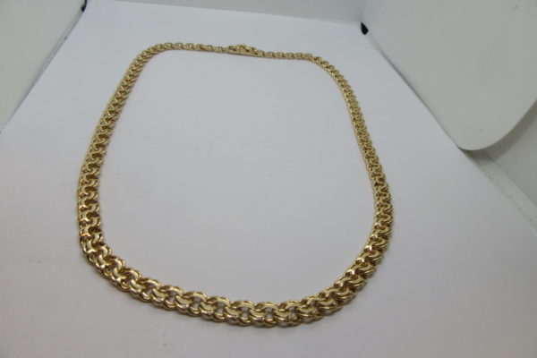 Täiesti uus ja Eestis käsitööna valmistatud kuld lihvitud kuningkett. Keti pikkus 60 cm, laius/kõrgus 5,2 x 5,2 mm, karplukk ja turvaaas. Kett väga ilusa tiheda mustriga ja Eestis äärmiselt vähelevinud. Kett kannab proovi 585, kaaluks 99,63 grammi, ning peal ka… Loe edasi →