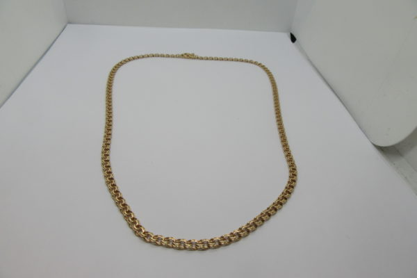 Väga heas korras ja käsitööna valmistatud kuld lihvitud ümar kuningkett. Keti pikkus 60 cm, laius/kõrgus 2,9 x 2,9 mm. Kett väga ilusa tiheda mustriga, Eestis äärmiselt vähelevinud. Kett kannab proovi 14K(585), kaaluks 27,55 grammi, Papagoilukk. Kuldketti saab EELNEVAL KOKKULEPPEL näha… Loe edasi →