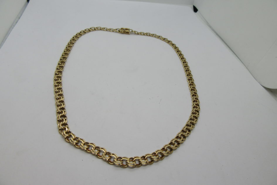 Heas korras ja puhastatud Soome käsitöö Bismarck kuldkett, sobib Naistele. Kuldketi pikkuseks on 42,5 cm; laius 5,7 mm ja kõrgus 1,9 mm. Kuldkett kannab proovi 585 ja Meistrimärk; Kvaliteedi- ja Soome aastamärk kaaluks 19,28 grammi, karplukk ja 2-turvaaasa. Kuldkett on meie poolt puhastatud, on korraliku välimusega, eseineb loomulikult kerget kulumist, sest tegu pole uue kuldketiga. Kuldketti saab EELNEVAL KOKKULEPPEL näha ja osta meie kontoris Virmalise 2, E-R 10-18 ja L-P kokkuleppel. Turuhind 1530-1750 eurot, Meie hind 1330.-Eurot.