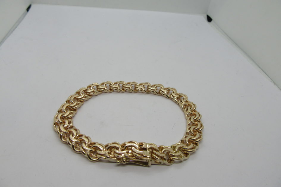 Täiesti uus ja Eestis käsitööna valmistatud Bismarck mustriga kuldkäekett. Käeketi pikkuseks on 20,9 cm-i ja laius 9,5 mm; kõrgus 3,5 mm. Kuldkäeketil on karplukk ja turvaaas. Käeketi kaaluks 36,55 grammi ja kannab proovi 585, peal ka meistrimärk ja meie firmamärk TL. Kuldkäeketti saab EELNEVAL KOKKULEPPEL näha ja osta meie kontoris Virmalise 2, E-R 10-18 ja L-P kokkuleppel. Turuhind 3290-3490 eurot, Meie hind 2949.- Eurot.
