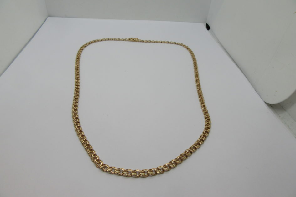 Täiesti UUS ja Eestis käsitööna valmistatud Bismarck mustriga kuldkett. Keti pikkuseks 50 cm, laius 4,1 mm, kõrgus 1,5 mm, korralik karplukk ja turvaaas. Keti kaaluks 14,65 grammi ja kannab proovi 585, ning peal ka meistrimärk, lisaks peal ka meie firmamärk TL. Kuldketti saab EELNEVAL KOKKULEPPEL näha ja osta meie kontoris Virmalise 2, E-R 10-18 ja L-P kokkuleppel. Turuhind 1690-1890 eurot, Meie hind 1449.-Eurot