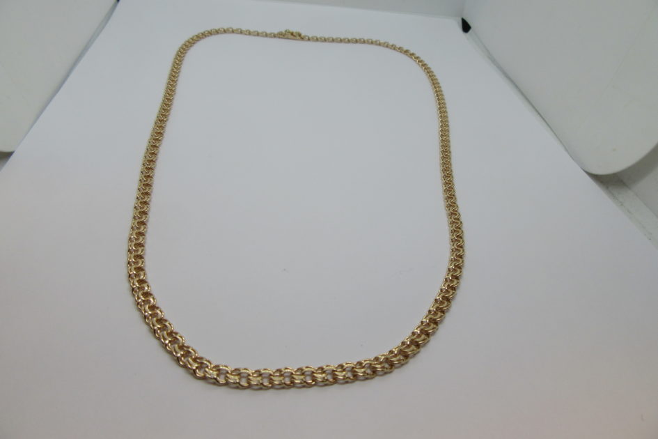 Täiesti UUS ja Eestis käsitööna valmistatud pikem Bismarck mustriga kuldkett. Keti pikkuseks 60 cm(tavaliselt teeme selles kaalus 50-55 cm pikkuses), laius 4,8 mm, kõrgus 1,8 mm, korralik karplukk ja turvaaas. Keti kaaluks 19,94 grammi ja kannab proovi 585, ning peal ka meistrimärk, lisaks peal ka meie firmamärk TL. Kuldketti saab EELNEVAL KOKKULEPPEL näha ja osta meie kontoris Virmalise 2, E-R 10-18 ja L-P kokkuleppel. Turuhind 1900-2100 eurot, Meie hind 1670.-Eurot!