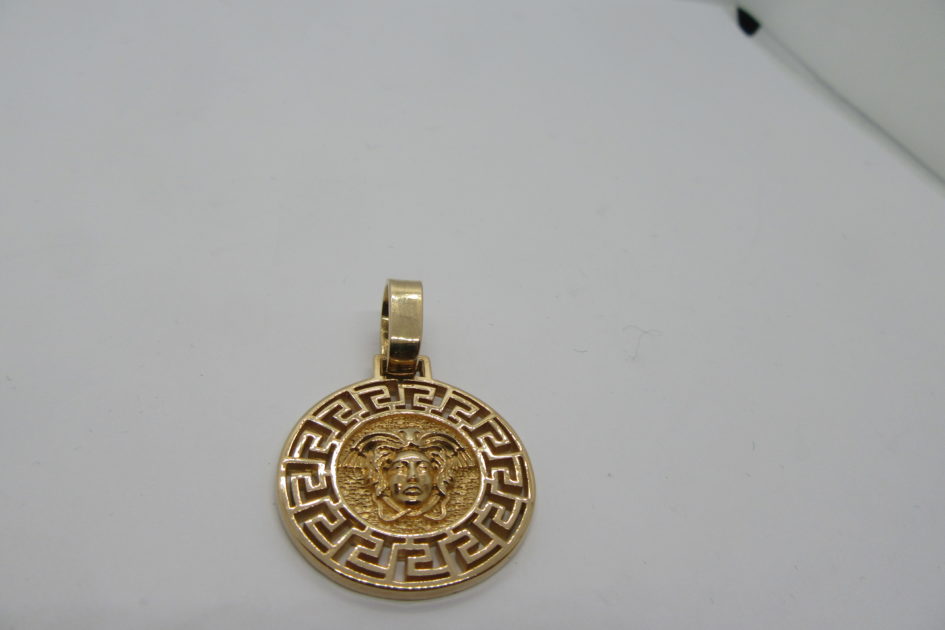 UUS MUDEL! Täiesti uus ja käsitööna valmistatud Versace motiiviga medaljon. Kuldmedaljoni diameeter on 26,2 mm, sobib kuldketile mõõtmetega kuni 11,2 x 6,5 mm, tagumine külg on poleeritud ja läikega, et sinna saab soovi korral ka graveeringu teha. Kuldmedaljon kannab proovi 585, peal ka meistrimärk, diameeter 26,2 mm ja kaaluks 11,42 grammi, tänu kergele kaalule on hind taskukohasem. Kuldmedaljoni saab EELNEVAL KOKKULEPPEL näha ja osta meie kontoris Virmalise 2, E-R 10-18 ja L-P kokkuleppel. Turuhind 1090-1230 eurot, Meie hind 945.-Eurot.
